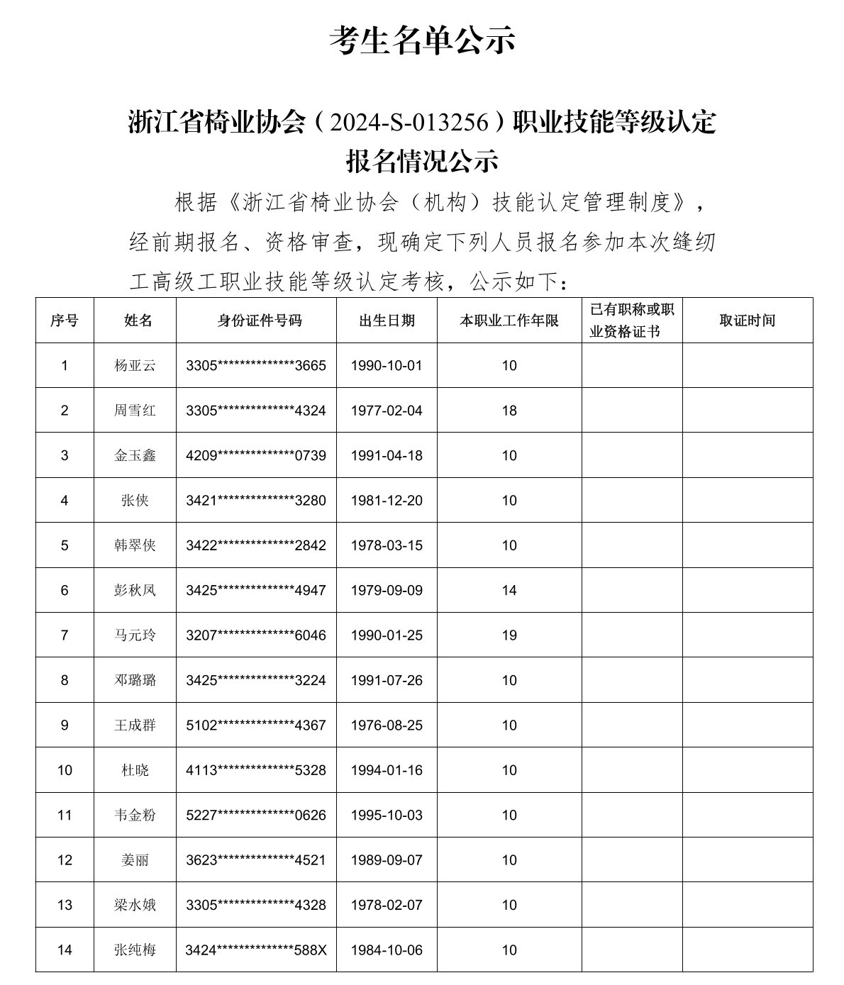 浙江省椅业协会(2024-S-013256)职业技能等级认定 报名情况公示